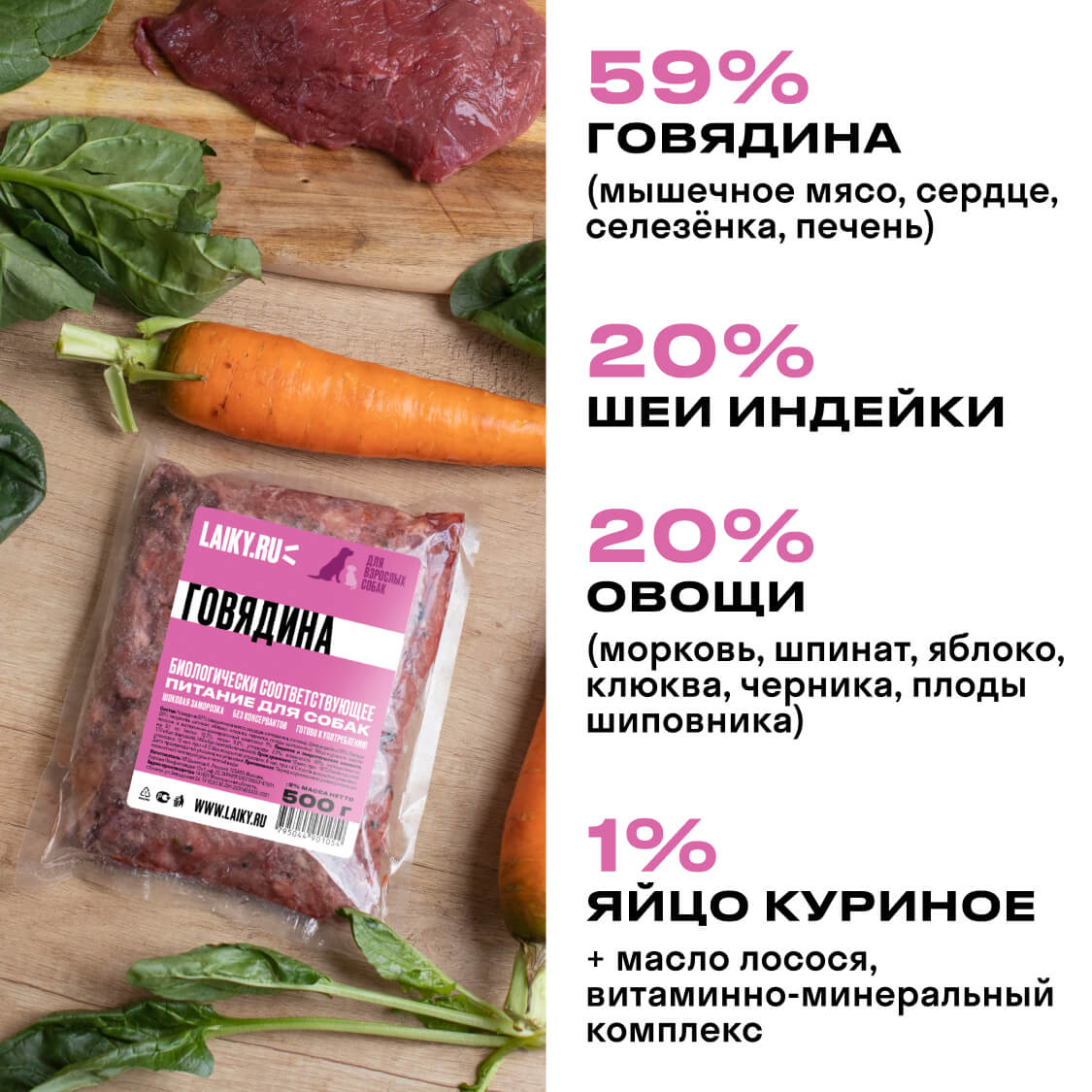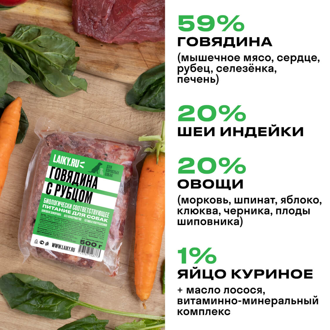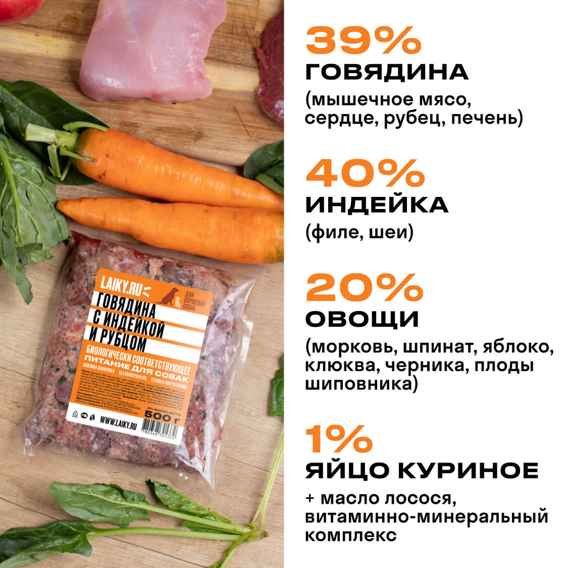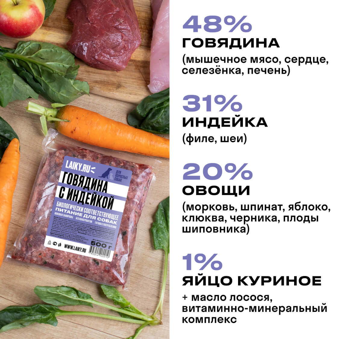 В составе LAIKY — мясо, субпродукты, костная составляющая, яйца, овощи и фрукты. Сырьё высшего качества human-grade уровня, предназначенное в пищу людям. Вы видите все ингредиенты невооруженным глазом и поэтому всегда уверены в качестве питания LAIKY.