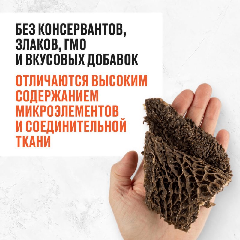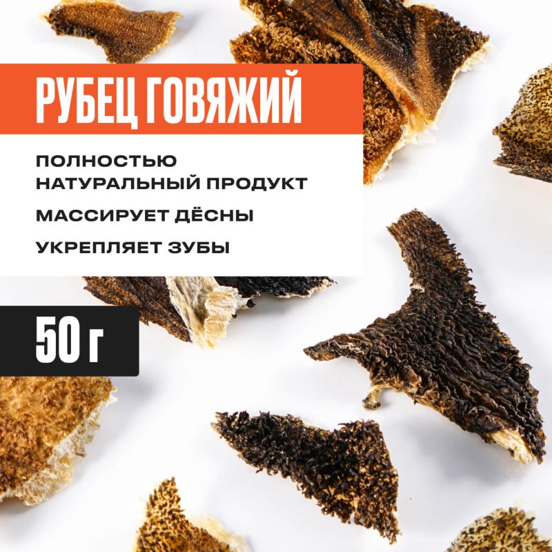Часть желудка коровы. Популярное и полезное, хотя и непривлекательное с виду угощение. Усиливает пищеварение и обмен веществ, благоприятно воздействует на микрофлору кишечника, улучшает аппетит. Сушёный рубец плотный по структуре, поэтому подходит для чистки зубов и профилактики заболеваний дёсен.